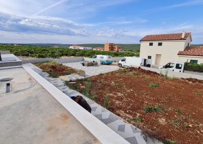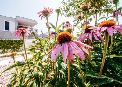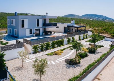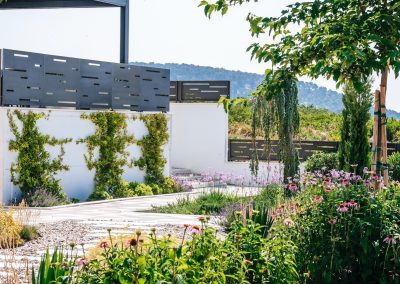 The plant selection is enriched with species such as lavender, rosemary, immortelle, and African lilies, ensuring fragrant and visual dynamics throughout the year. Peripheral areas and privacy zones are defined by Japanese mock orange hedges (Pittosporum tobira), while pedestrian and vehicular paths are clearly separated by modern pavers, creating a functional and harmonious whole.