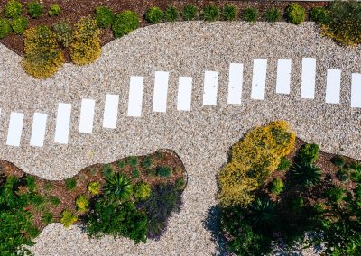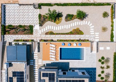 From the air, the precise geometry of the paths is visible, integrated into the organic, amoeboid forms of the garden beds. This contrast between the clean lines of the walking surfaces and the rich plant undergrowth, such as lavender and immortelle, faithfully captures a modern interpretation of the indigenous Dalmatian landscape.