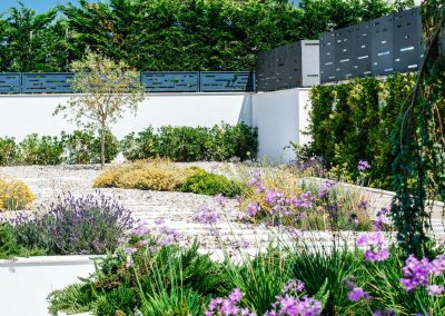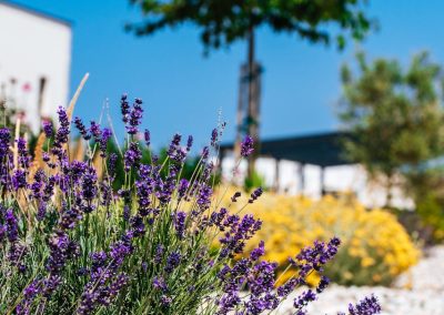 Designing a modern Mediterranean garden according to a Floramye project involves, in addition to carefully combined perennial beds, the systematic use of stone mulch. By mimicking the original landscape surrounding the property, this combination of natural materials and indigenous plants serves as a winning aesthetic solution. The backbone of the garden consists of amoeboid-shaped areas filled with aromatic and flowering perennials that soften the rigid lines of the architecture.
